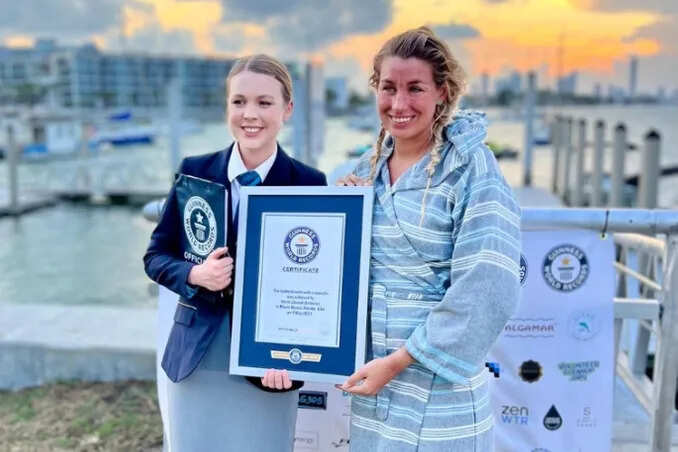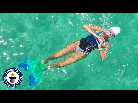 கின்னஸ் புத்தகத்தின் தகவல் படி, கடந்த மாதம் 7-ம் தேதியன்று, மியாமி 'ஈகோ மெர்மெய்ட்' மெர்லே லீவாண்ட் அமெரிக்காவின் புளோரிடாவின் மியாமி கடற்கரையில் 42.2 கிலோ மீட்டர்களை (26.22 மைல்கள்) கடலில் நீந்தி தனது சொந்த சாதனையை முறியடித்தார். இதற்காக அவர் எடுத்துக்கொண்ட நேரம் 11 மணிநேரம் மற்றும் 54 நிமிடங்களாகும்.