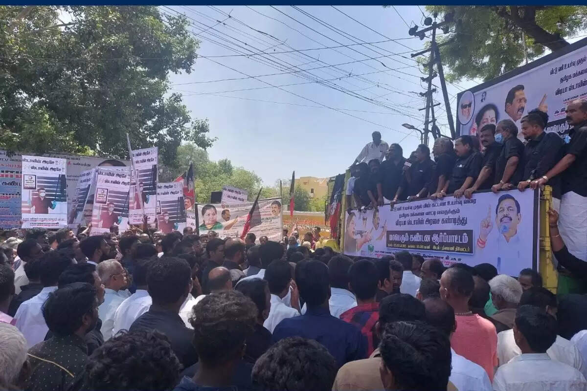 மதுரை முனிச்சாலை பகுதியில் அதிமுக சார்பில் அதன் அமைப்பு செயலாளரும், எம்.எல்.ஏவுமான செல்லூர் ராஜூ தலைமையில் நடைபெற்ற ஆர்பாட்டத்தில் சுமார் 500 தொண்டர்கள் கருப்பு சட்டை அணிந்து பங்கேற்று திமுக அரசுக்கு எதிராக முழக்கம் எழுப்பினர்.