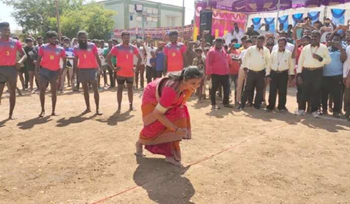 Actor and MLA RK Roja playing kabaddi while inaugurating the competition in Nagari #kabaddi #AndhraPradesh pic.twitter.com/dCw11YljMX