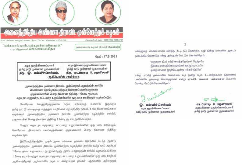இதுதொடர்பாக அதிமுக ஒருங்கிணைப்பாளர் ஓ.பன்னீர்செல்வம், இணை ஒருங்கிணைப்பாளர் எடப்பாடி பழனிசாமி ஆகியோர் வெளியிட்டுள்ள அறிக்கையில், “கொரோனா பெருந்தொற்றினால் கடும் பாதிப்புக்கு உள்ளாகி இருக்கும் தமிழ்நாட்டு மக்களுக்கு மருத்துவ வசதிகளை ஏற்படுத்தித் தரவும், உரிய நிவாரணங்களை வழங்க அனைத்திந்திய அண்ணா திராவிட முன்னேற்றக் கழகத்தின் சார்பில் முதல்-அமைச்சர் பொது நிவாரண நிதிக்கு ஒரு கோடி ரூபாய் அளிக்கப்படும்.