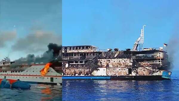 இந்நிலையில், மீட்பு பணியின்போது எடுக்கப்பட்ட ஒரு வீடியோ வெளியாகி உள்ளது. கப்பலின் ஒரு பகுதி தீப்பற்றி எரியும் நிலையில், கப்பலில் இருந்து ஊழியர்கள் மற்றும் பயணிகள் கடலில் குதிக்கும் காட்சி அதில் பதிவாகி உள்ளது. கப்பலை சுற்றி தயார் நிலையில் உள்ள மீட்பு குழுவினர், பயணிகளை ரப்பர் படகுகளில் ஏற்றும் காட்சியும் பதிவாகி உள்ளது.