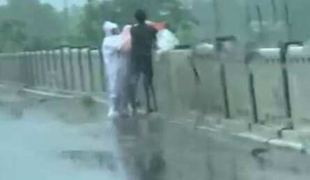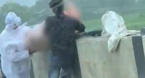 On camera, two men - one of them in a PPE suit - are seen lifting a body on the bridge over river Rapti.