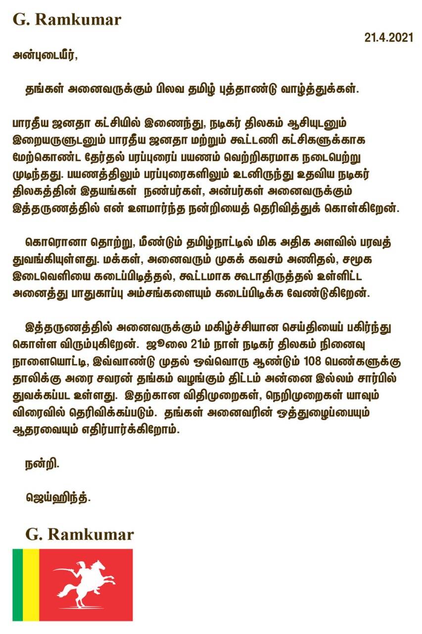 இந்த வருடம் முதல் ஒவ்வொரு வருடமும் 108 பெண்களுக்கு அரை சவரன் தங்கம் வழங்குவதாக அறிவித்திருந்ததையொட்டி, ராம்குமார் அறிக்கை ஒன்றை வெளியிட்டுள்ளார்.