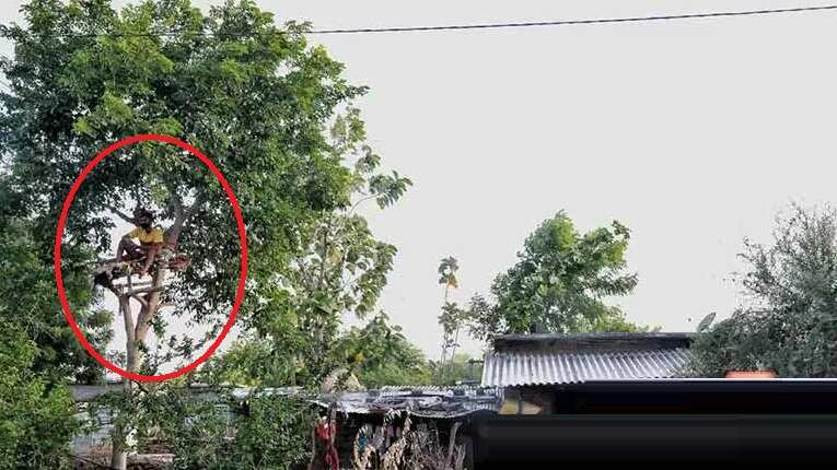 இந்த நிலையில் வீட்டுக்கு அருகேயுள்ள மரத்தின் மீதேறி, தனிமைப்படுத்திக் கொள்ள முடிவு செய்தார். அதன்படி, மரத்தின் மீது கட்டில் கட்டி, சிவா தன்னை தனிமைப்படுத்திக் கொண்டார். அவருக்கு தேவையான உணவு மற்றும் மருந்தை, கயிற்றின் மூலம் அவரது குடும்பத்தினர் வழங்கி வருகின்றனர். கடந்த 11 நாட்களாக அவர் இப்படி தன்னை தனிமைப்படுத்திக் கொண்டிருக்கிறார்.