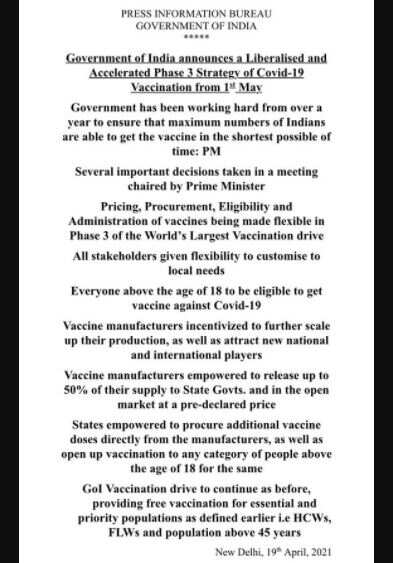 இந்நிலையில் தற்போது 45 வயதிற்கு மேற்பட்டோருக்கு தடுப்பூசி போடப்படும் நிலையில் மே 1-ஆம் தேதி முதல் 18 வயதுக்கு மேற்பட்டோருக்கு கொரோனா தடுப்பூசி போடப்படும் என மத்திய அரசு அறிவித்துள்ளது.