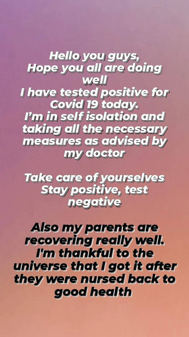 பெற்றோர்கள் குணமான நிலையில் தற்போது நடிகைக்கு கொரோனா !!