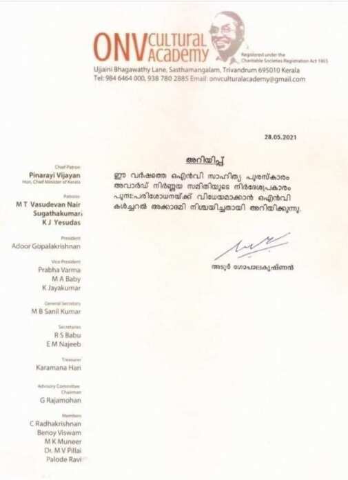விருதுகள் குழுவின் பரிந்துரையின்படி இந்த ஆண்டு அறிவிக்கப்பட்டிருக்கும் ஓ.என்.வி இலக்கிய விருது குறித்து மறுபரிசீலனை செய்ய முடிவு செய்துள்ளோம் என ஓ.என்.வி கலாச்சார அகாடமி தெரிவித்துள்ளது.