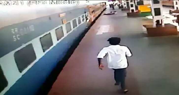 ஆனால் அந்நபர் கிழே விழுந்தாலும் வண்டியின் கம்பியை இறுக்கமாக பிடித்துக்கொண்டார். இதனால் அவர் கிழே விழாமல் சிறிது தூரம் இழுத்து செல்லப்பட்டு போராடினார். இதனை கண்ட அங்கு பாதுகாப்பு பணியில் இருந்த ரயில்வே போலீசார் சிரிஜித் துரிதமாக செயல்பட்டு அடுத்த நில விநாடிகளில் அவரது உயிரை காப்பாற்றினார்.